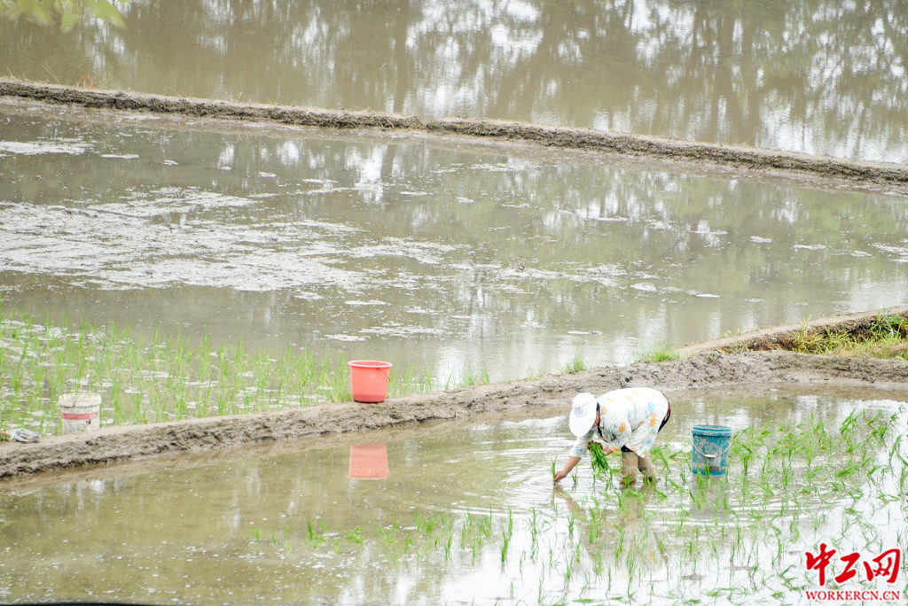 2020年6月4日,江西省吉安市遂川县泉江镇洋村村,农民在整田、插秧。芒种时节,时不待我,遂川县农民抢抓农时,抢插中稻,确保粮食丰产丰收。肖远泮/IC photo