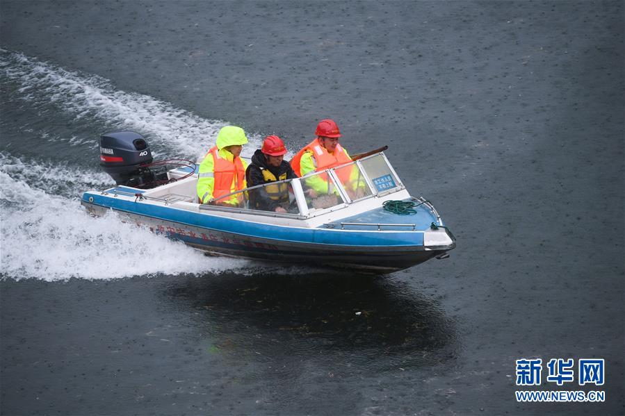 6月4日,水涛庄水库的应急抢险队员乘坐冲锋舟参加防汛抢险应急演练。 新华社记者 徐昱 摄