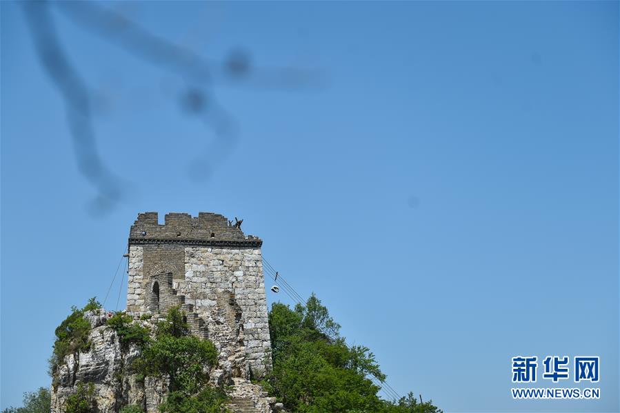 这是6月3日拍摄的箭扣长城,修缮工人在使用索道运送施工物资。 位于北京市怀柔区的箭扣长城以雄奇、险峻闻名,夏日里的箭扣长城掩映在山峦叠翠中,分外壮丽。 新华社发(陈钟昊摄)