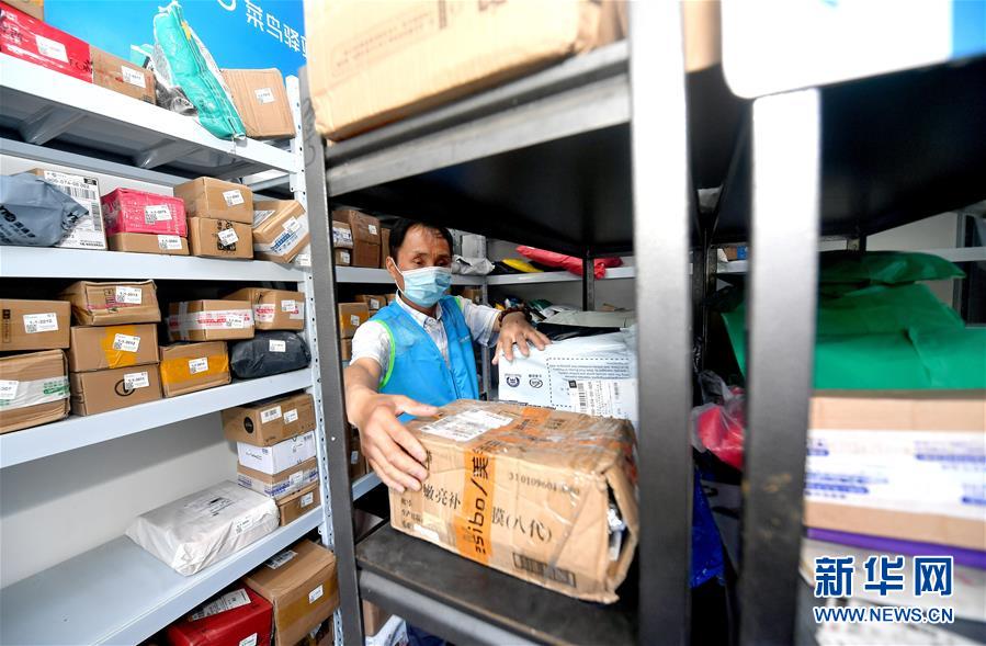 6月3日,李恺在非饭点的时间整理快递点里的快递。新华社记者 刘潇 摄