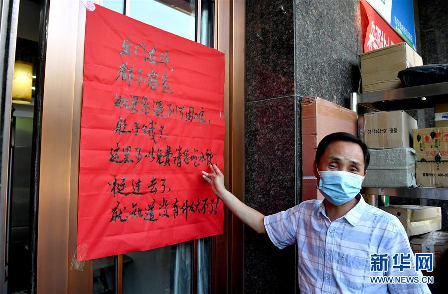 6月3日,李恺介绍自己张贴在饺子馆门口的告示。新华社记者 刘潇 摄