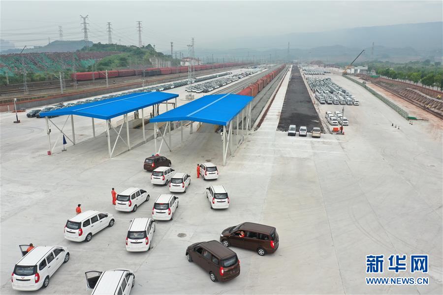 6月4日,在重庆鱼嘴物流基地,商品车在等待装车(无人机照片)。 新华社记者 唐奕 摄