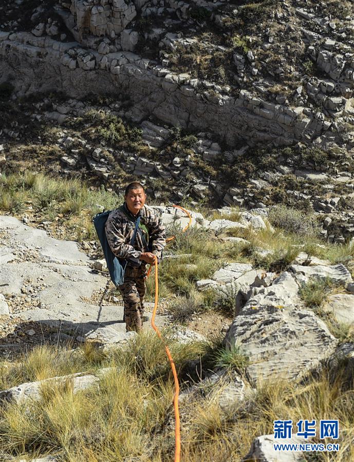 5月14日,阿日并爬下悬崖,整理给岩羊喂水用的胶皮管。新华社记者 彭源 摄