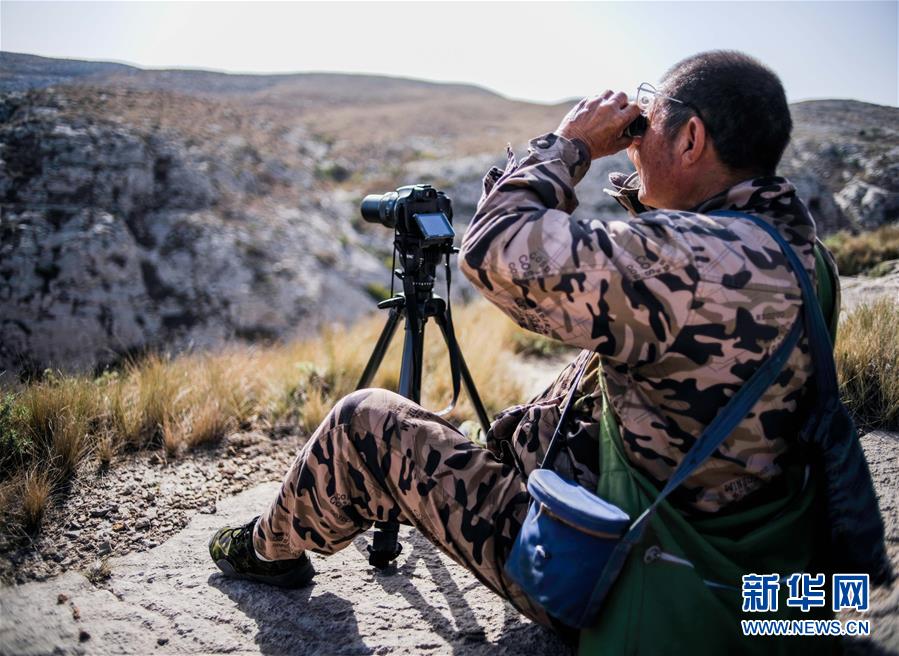 5月14日,阿日并在山顶观察岩羊踪迹。新华社记者 连振 摄