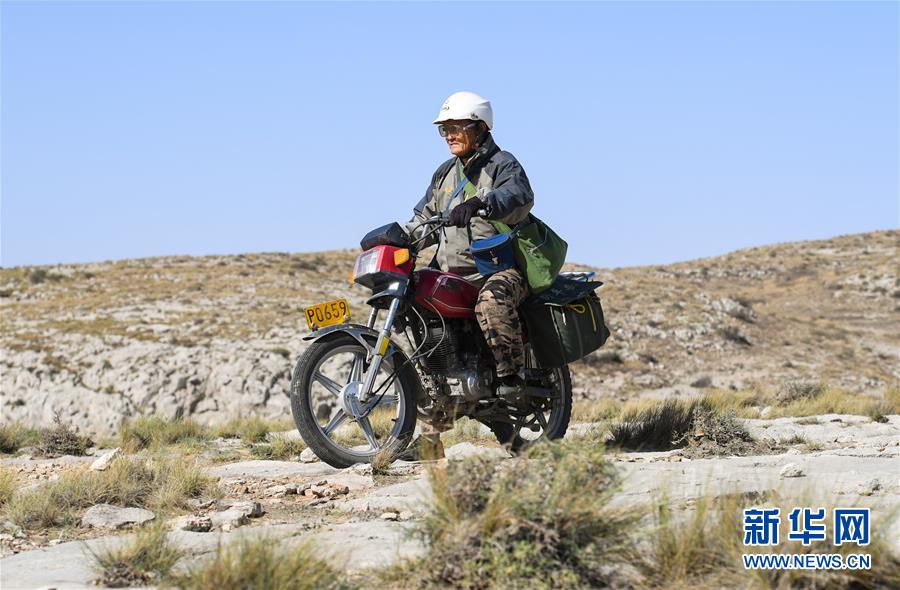 5月11日,阿日并骑着摩托给岩羊送水。新华社记者 彭源 摄
