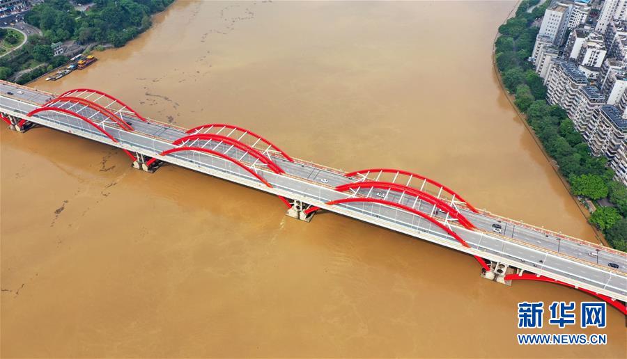 6月4日,柳江洪峰通过柳州市区河段(无人机照片)。新华社发(黎寒池 摄)