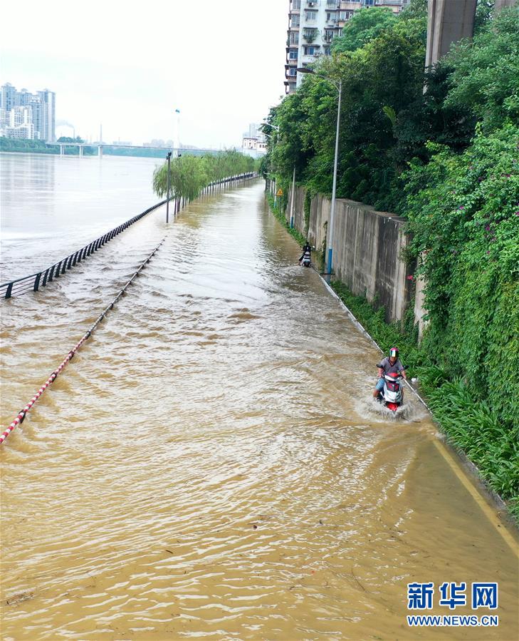 6月3日傍晚时分,在广西柳州市滨江西路延长线,市民从被洪水淹没的低洼路段经过(无人机照片)。新华社发(黎寒池 摄)