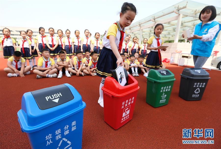 6月4日,山东青岛市即墨区华山路小学的学生在即墨区住房和城乡建设局志愿者的指导下将代表不同垃圾的卡片投入分类垃圾桶。 在6月5日“世界环境日”到来之际,山东青岛市即墨区开展“保护环境 从我做起”主题教育进校园活动,通过帮助孩子们了解生态保护意义,掌握垃圾分类方法,学习污水处理及节约用水知识,引导他们从小养成爱护环境、节约资源的生活习惯。 新华社发(梁孝鹏 摄)