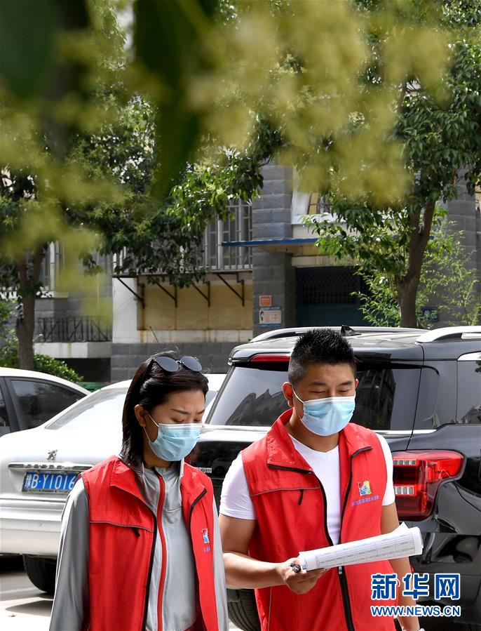 吕洋(右)和同事一起交流入户走访情况(6月2日摄)。新华社记者李安摄