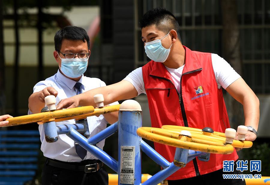 吕洋(右)在分管辖区内的一个小区里检查健身设施是否损坏或存在安全隐患(6月2日摄)。新华社记者李安摄