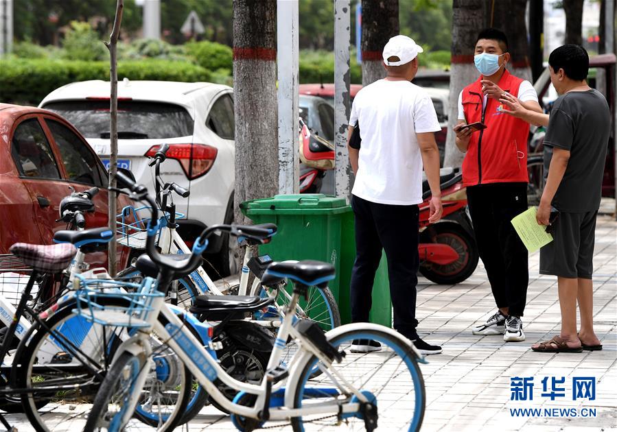 吕洋(中)在巡查时解答居民反映的问题(6月2日摄)。新华社记者李安摄
