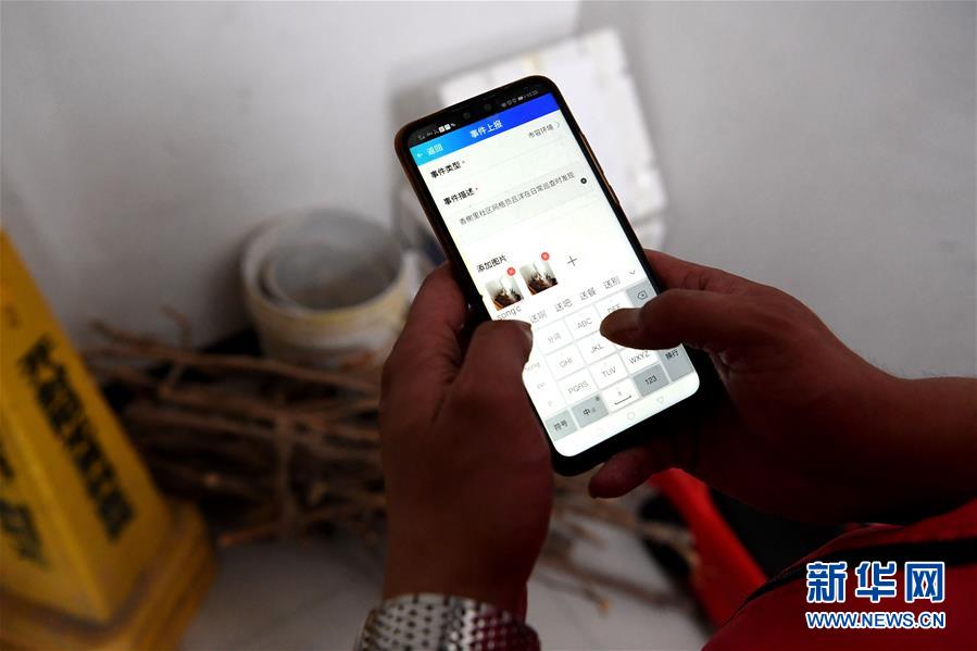 吕洋在分管辖区内的居民楼中发现消防通道内有垃圾杂物乱堆乱放,使用手机软件上报事件信息(6月2日摄)。新华社记者李安摄
