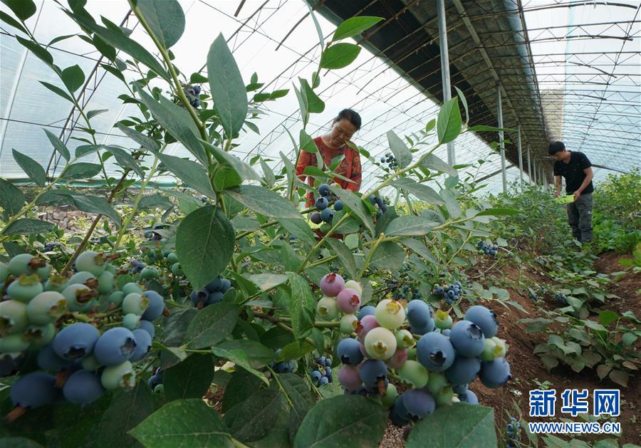 6月4日,唐山市丰润区火石营镇赵庄子村百草坡农产品农民专业合作社社员在生态农业园的大棚内采摘蓝莓。新华社记者 郭雅茹 摄