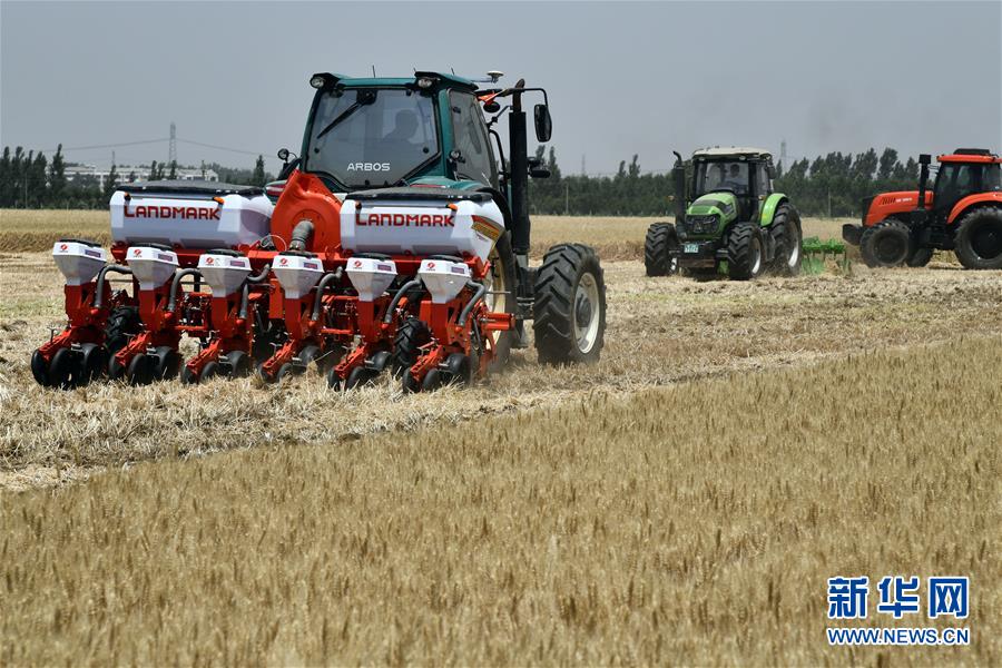 6月3日,播种机在汶上县郭仓镇麦田里作业。 记者从山东省农业农村厅获悉,今年“三夏”期间,山东省有180万台农机、28万名农机技术人员和农机手参与“三夏”作业。 新华社记者 郭绪雷 摄