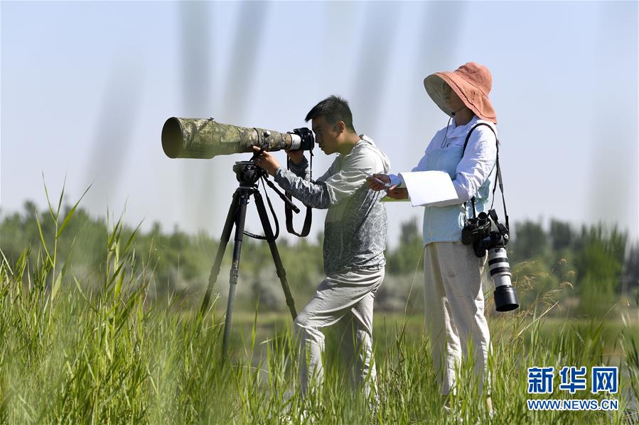 6月3日,李学明(左)和同事张海荣在监测记录黄河湿地的鸟类活动。