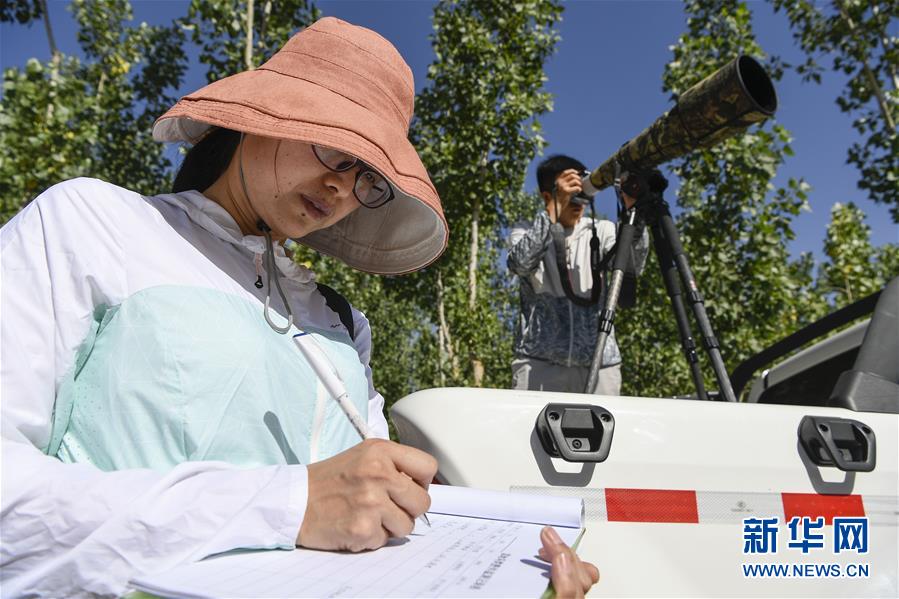 6月3日,李学明的同事张海荣(左)在填写湿地鸟类野外监测记录表。 新华社记者 冯开华 摄