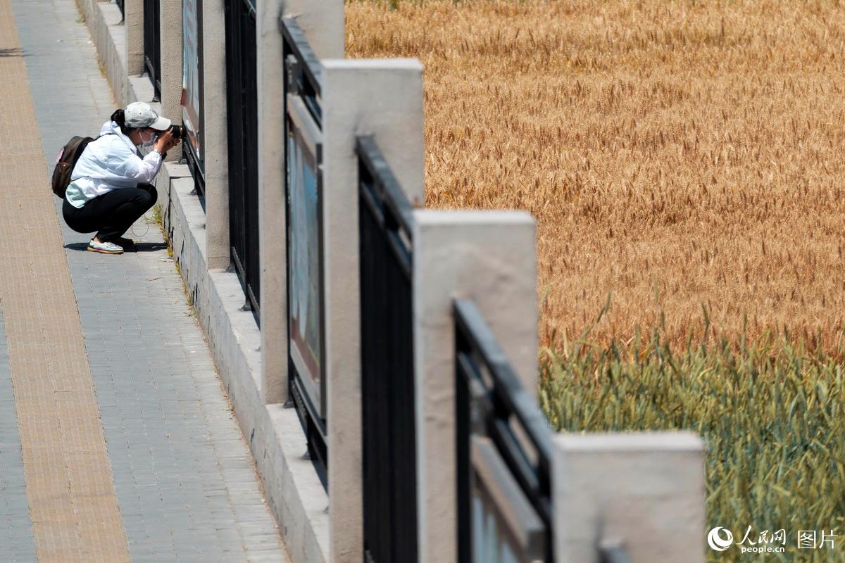 6月4日,位于北京北三环边,被称为“最贵麦田”马上就要进入收割期,放眼望去,麦浪滚滚,满目丰收的金黄,形成京城一道独特的田园风光。这片隐藏在城市高楼之间,占地面积约150亩的麦田是中国农业科学院的试验田,用来种植培育各种试验用的麦子。(人民网记者 翁奇羽 摄)