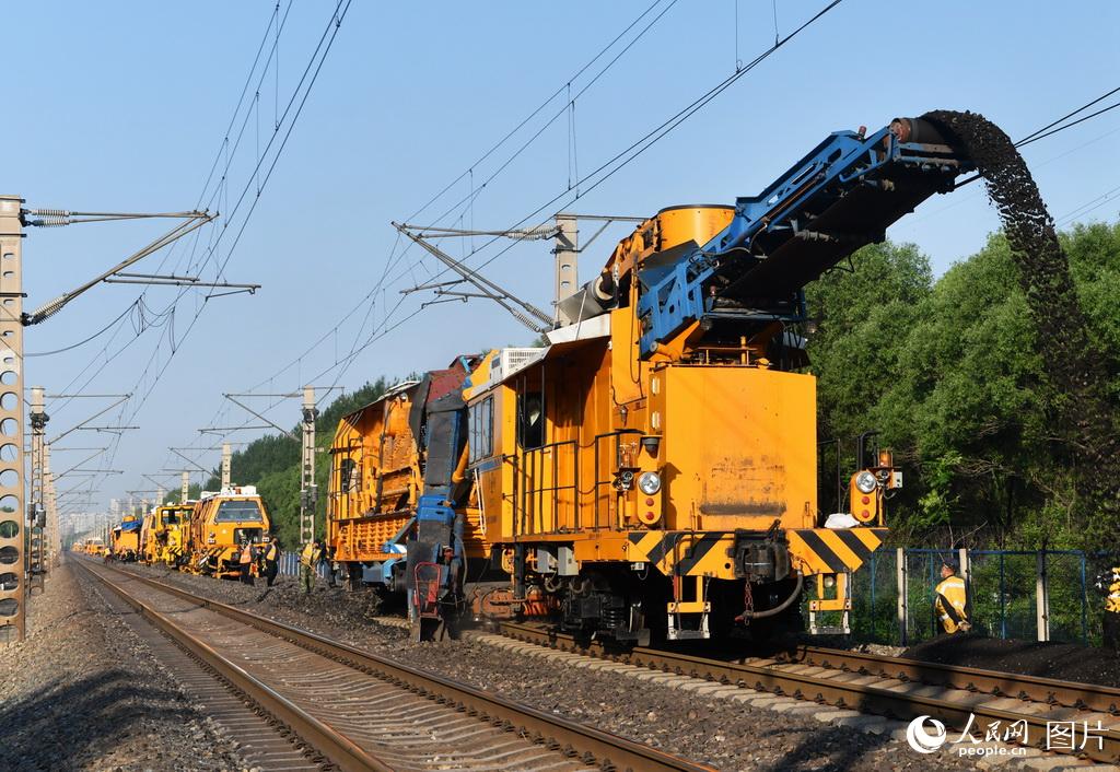 6月4日,一组大型养路机械在京哈铁路线得胜台站至铁岭站间进行线路清筛作业。