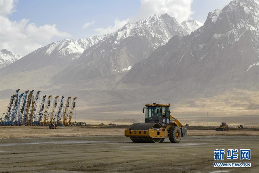 压路机在新疆塔什库尔干机场施工现场进行平整作业(6月3日摄)。新华社记者 胡虎虎 摄