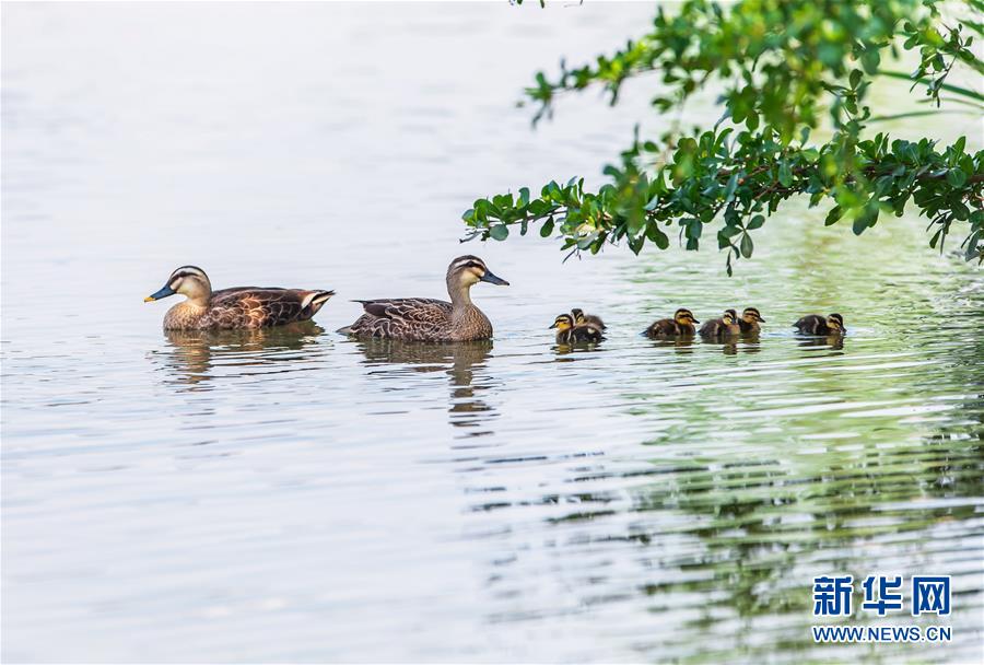 海珠湿地的斑嘴鸭一家(4月29日摄)。经过科学治理,生物多样性显著提升,海珠湿地鸟类从72种增加到177种,鱼类从46种增加到58种,昆虫种类从66种提升至285种。 新华社发(谢惠强摄)
