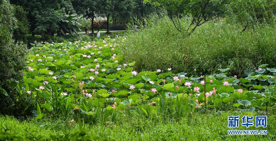 正值盛花期,市民在海珠湿地观赏菖蒲和荷花(6月3日摄)。经过科学治理,生物多样性显著提升,海珠湿地维管束植物从379种增加到630种。 新华社记者刘大伟摄
