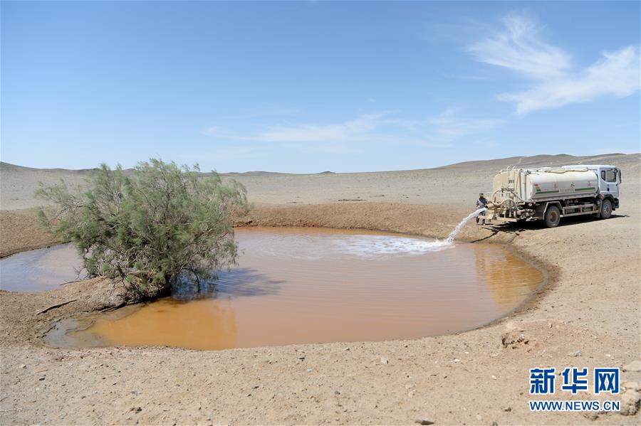 在新疆卡拉麦里山有蹄类野生动物自然保护区,管护员为水源地灌水(6月3日摄)。新华社记者 丁磊 摄