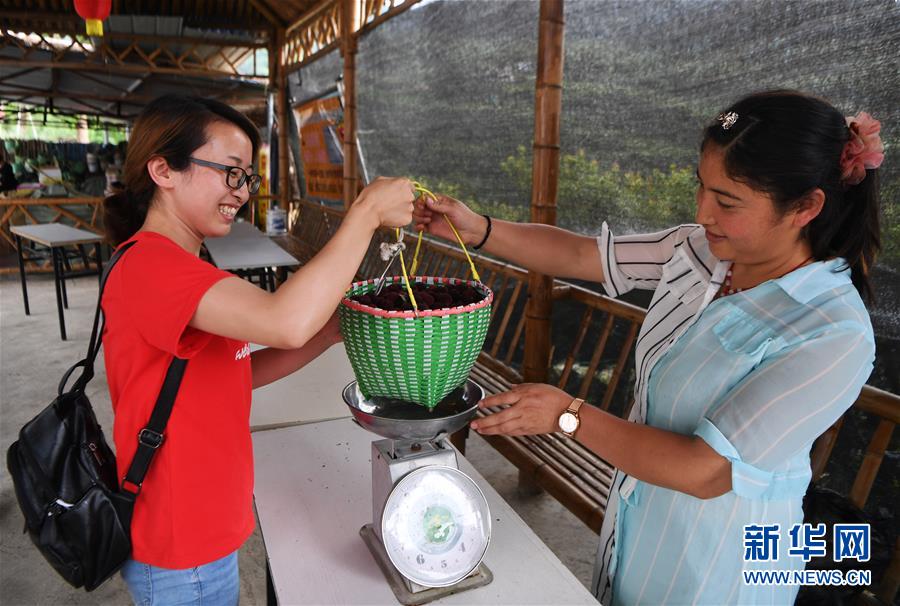 6月4日,燕山乡泉水村杨梅基地工作人员(右)给游客采摘的杨梅称重。 近日,位于重庆市万州区燕山乡泉水村的1000余亩杨梅陆续进入采摘期。近年来,泉水村通过完善基础设施、举办燕山杨梅节等举措,将杨梅产业与乡村旅游有机融合,有效促进了当地村民就业增收,助力乡村振兴。 新华社记者 王全超 摄