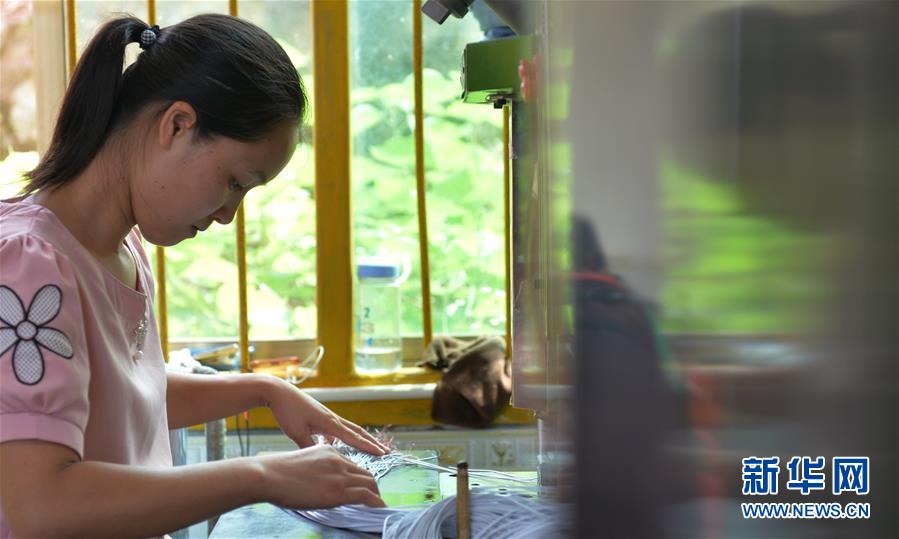 6月4日,一名女工在永州市新田县一处易地搬迁集中安置点的扶贫车间里加工电器零部件。新华社记者 赵众志 摄