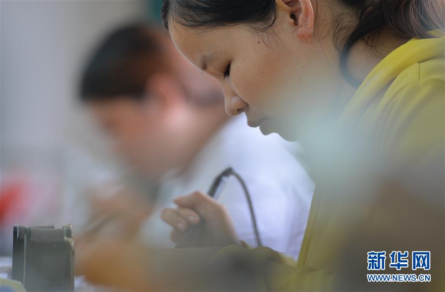 6月4日,工人在永州市新田县一处易地搬迁集中安置点的扶贫车间里加工电器零部件。新华社记者 赵众志 摄