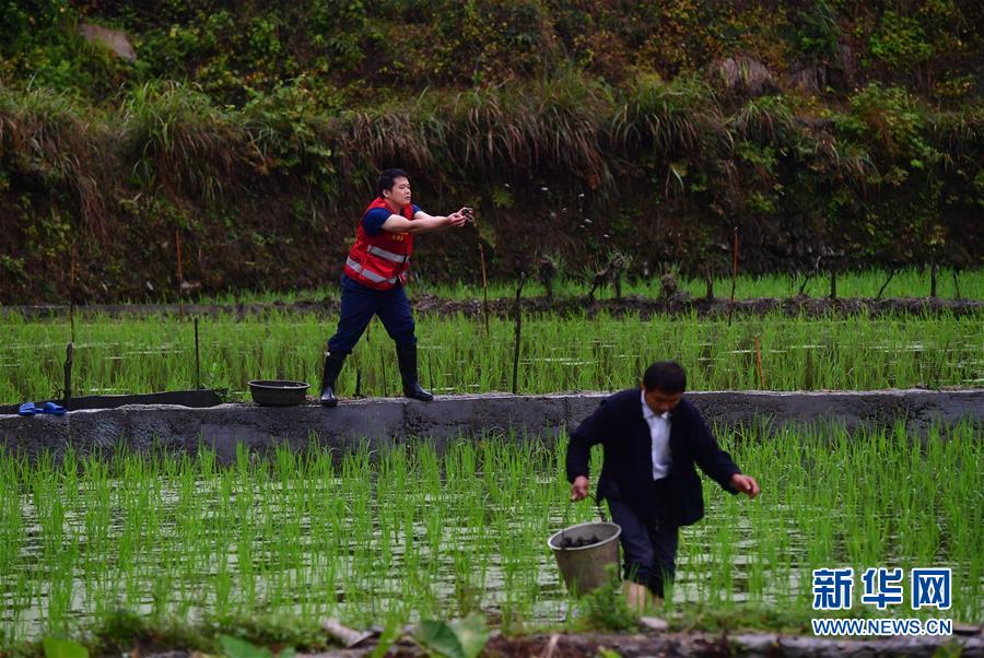 6月4日,在广西融水苗族自治县杆洞乡归江村,驻村扶贫工作队员和村民向稻田投放螺苗。 广西融水苗族自治县杆洞乡归江村位于大苗山深处,是一个深度贫困村。近年来,当地引导村民发展土鸡、田螺、食用菌、杉木等特色种养产业,增加收入,逐步实现脱贫。2016年至2019年,归江村的贫困户从377户降至31户,贫困人口从1671人降至131人。今年,归江村即将实现整村脱贫摘帽。 新华社记者 黄孝邦 摄