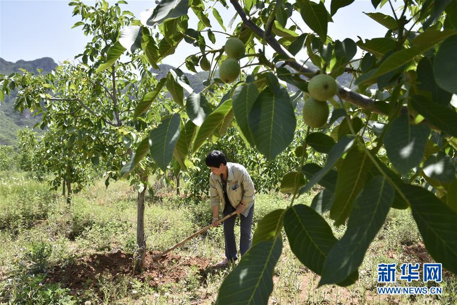 5月22日,工作人员在河北涉县西达镇西达村为核桃树锄草。 新华社记者 冯维健 摄