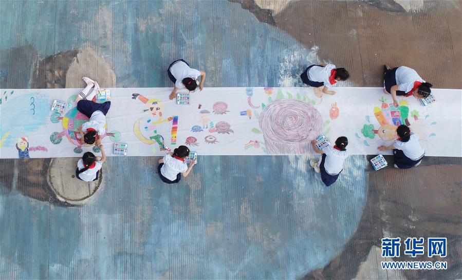6月4日,在江苏省海安市523文化产业园,海安市南屏小学的学生进行环保主题绘画(无人机照片)。新华社发(向中林 摄)