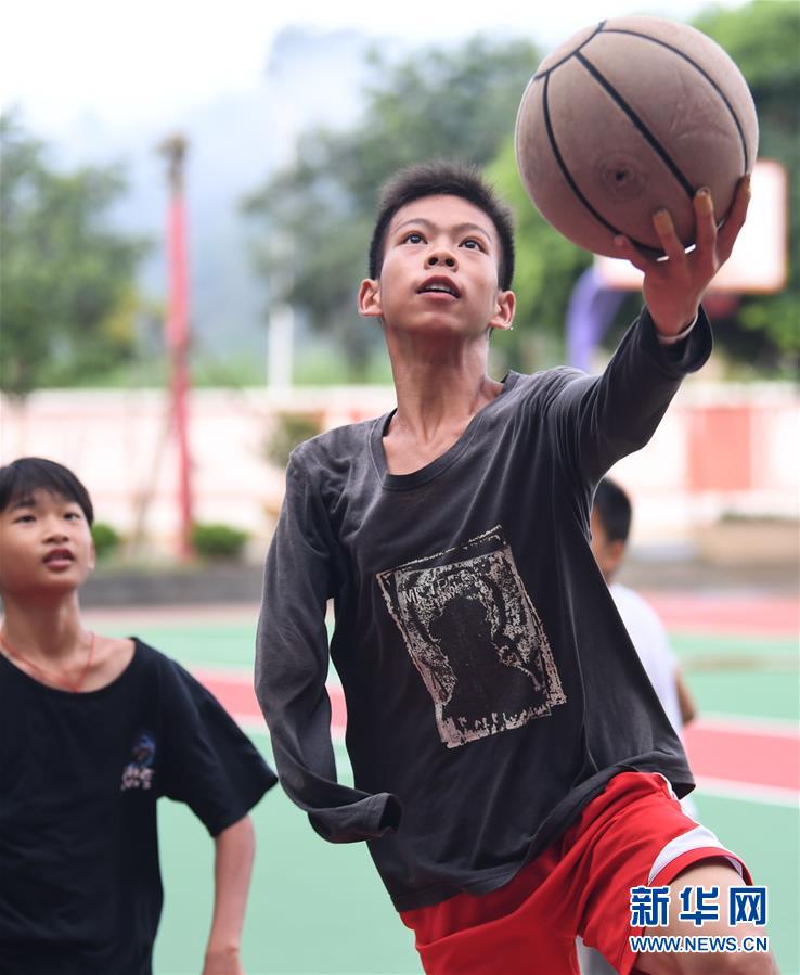 图为6月4日,张家城(右)早课前在操场上和同学打篮球。 新华社记者 邓华 摄