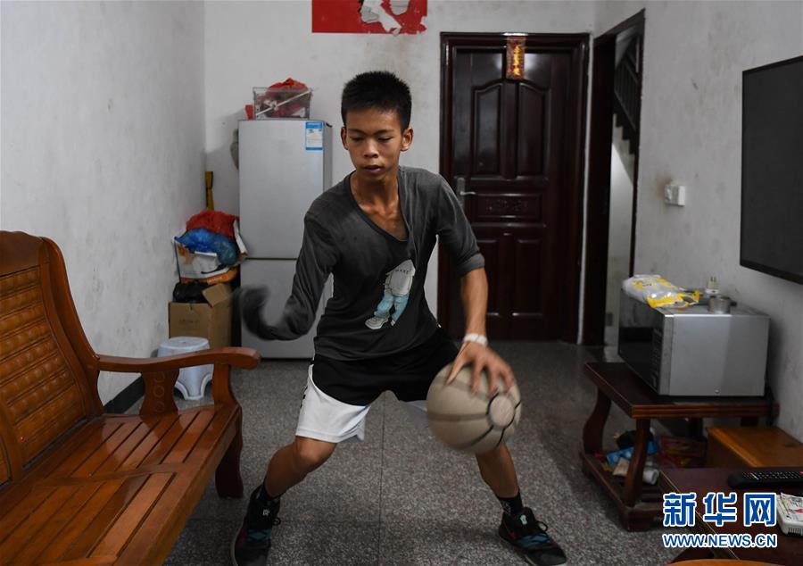 图为6月3日,张家城放学后在家中房间练习运球。 新华社记者 邓华 摄