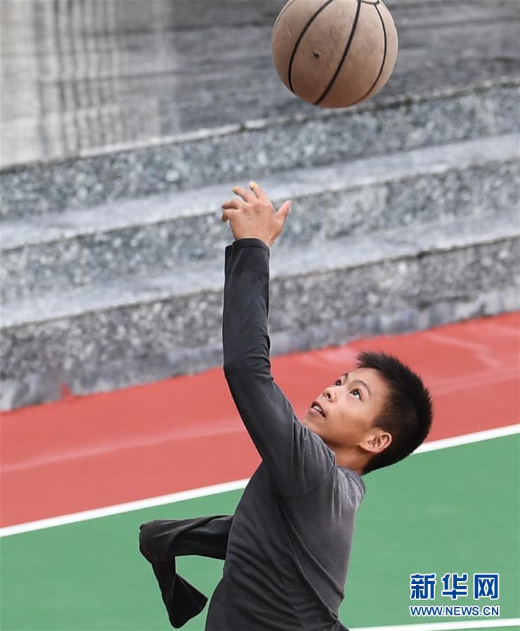 图为6月4日,张家城早课前在学校操场上打篮球。 新华社记者 邓华 摄