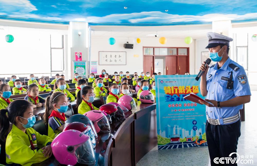 央视网消息:6月4日,内蒙古呼和浩特市玉泉区通顺街小学学生在学习佩戴安全头盔常识。当日,内蒙古呼和浩特市玉泉区通顺街小学联合市公安局交管支队玉泉大队景区中队开展“带好头盔 平安上学”安全守护行动,交警通过现场讲解安全头盔的正确佩戴方法和系安全带的重要性,引导学生在乘坐电动车、摩托车时要正确佩戴安全头盔,避免意外伤害,从小养成文明出行的良好习惯,做文明交通的践行者和传播者。(丁根厚 摄影报道)