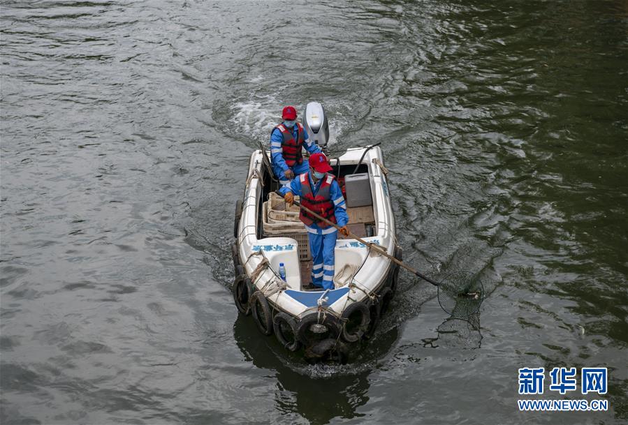 6月4日,李春伟(后)和同事在盘龙江上工作。新华社发(陈欣波 摄)
