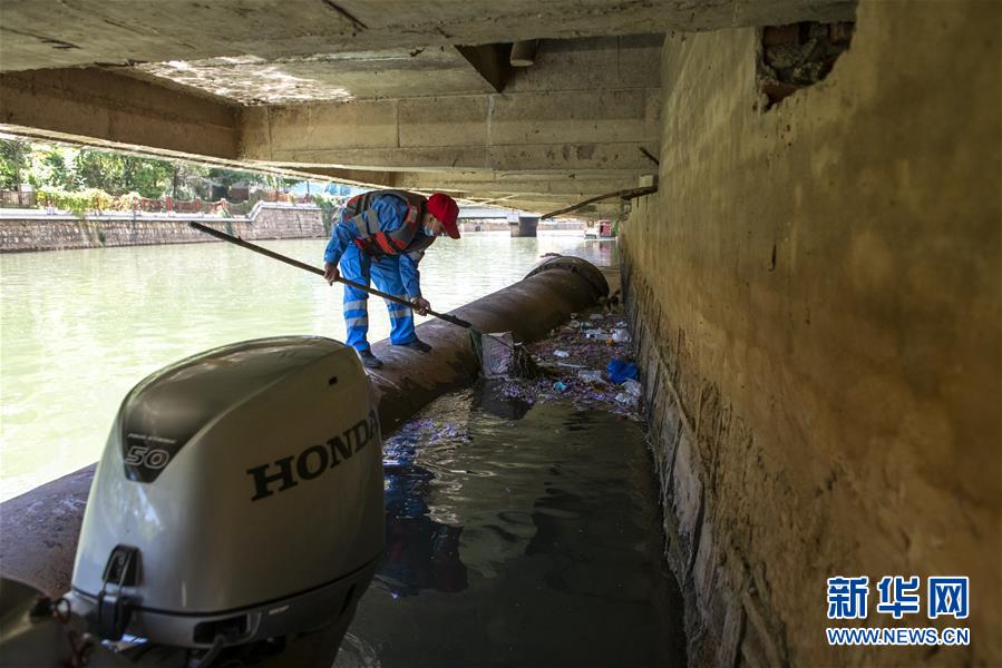 6月4日,李春伟在打捞垃圾。新华社发(陈欣波 摄)