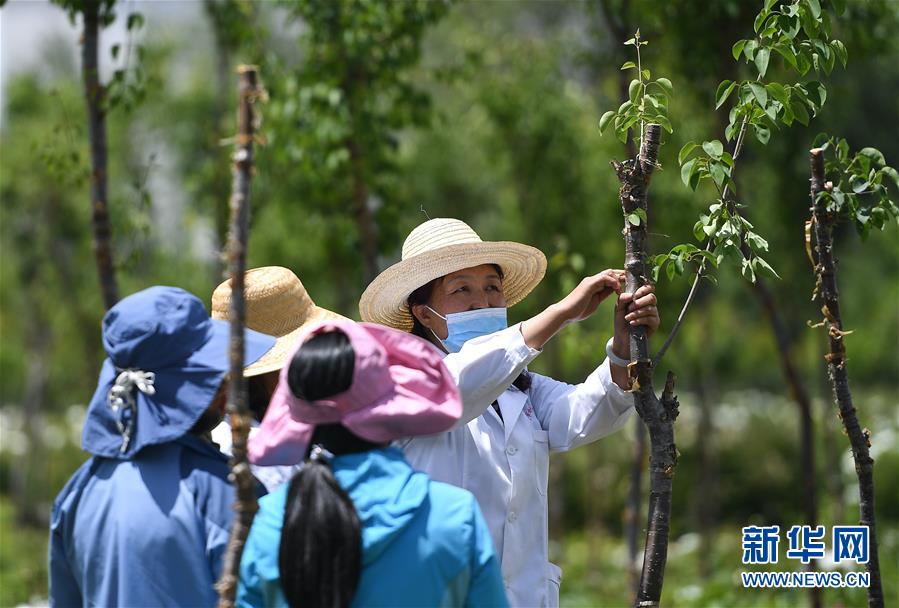 6月3日,在西宁市林业科学研究所祁家城育苗基地,张锦梅(右一)在讲解丁香嫁接技术要点。 新华社记者 薛玉斌 摄