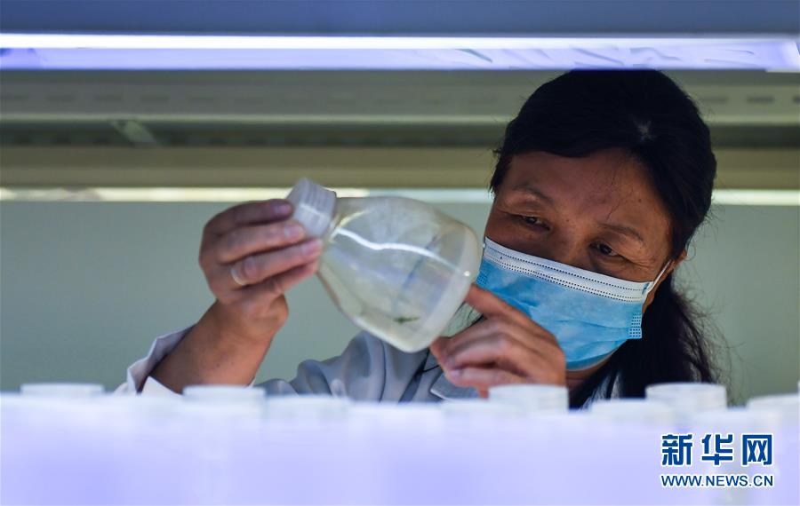 6月3日,在西宁市林业科学研究所,张锦梅在查看四季蓝丁香外植体的生长情况。 新华社记者 薛玉斌 摄