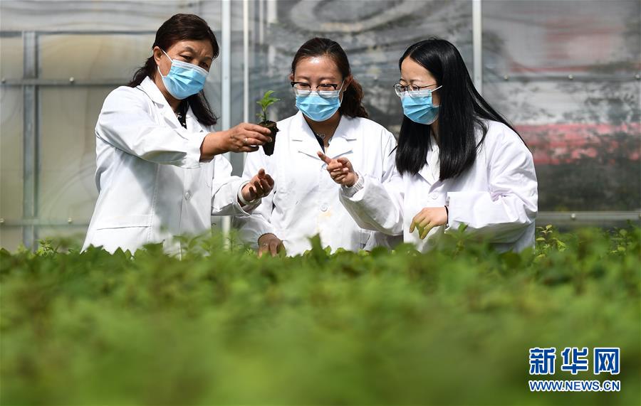 6月3日,在西宁市林业科学研究所,张锦梅(左)和团队成员满丽婷(中)、罗旭鹏探讨丁香选优的标准。 新华社记者 薛玉斌 摄