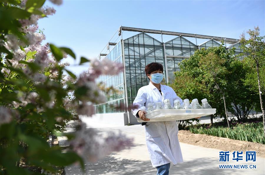 6月3日,在西宁市林业科学研究所,工作人员贾晓兰将丁香组培苗搬运至温室,准备进行炼苗。 新华社记者 薛玉斌 摄
