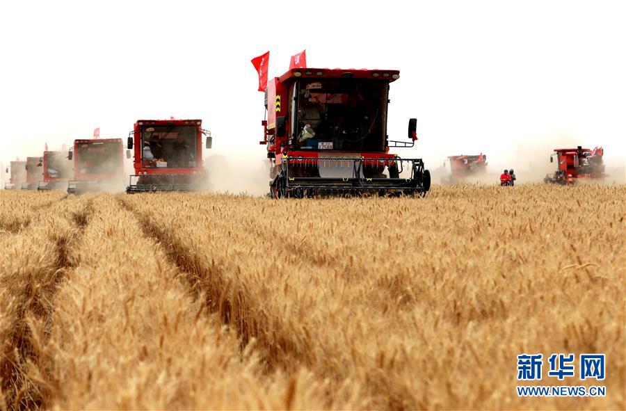6月5日,工作人员驾驶联合收割机在河北成安县辛义乡一处麦田里收割小麦。 新华社记者 王晓 摄