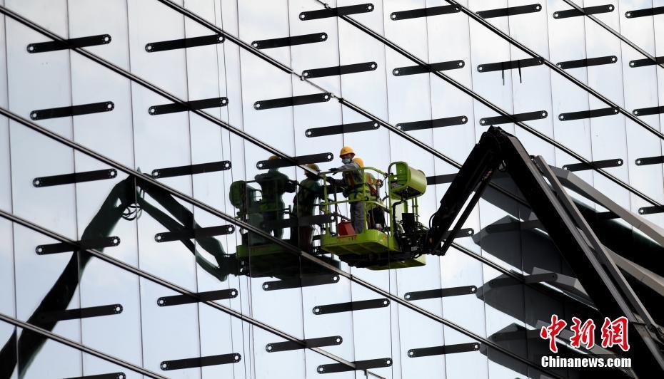 6月4日,四川成都,东安湖体育公园三馆项目工地,工人师傅正在高空安装幕墙。作为第31届世界大学生夏季运动会主场馆的东安湖体育公园体育场馆项目建设进入冲刺,幕墙等安装工作正在加速进行。 中新社记者 刘忠俊 摄