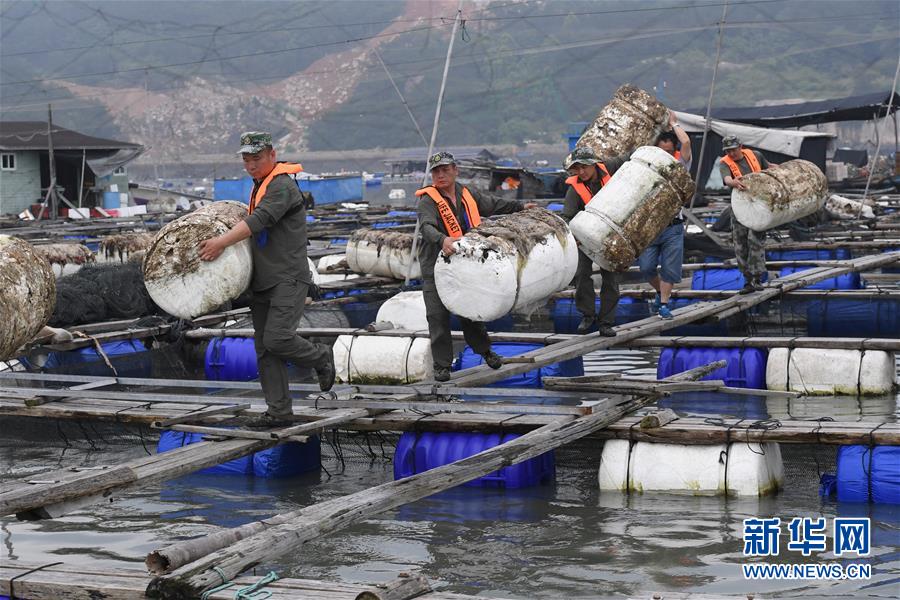 6月4日,在福建省宁德市霞浦县北壁乡海上渔排养殖区,工作人员在收集传统泡沫浮球,取而代之的是新型塑料浮球。 新华社记者 姜克红 摄