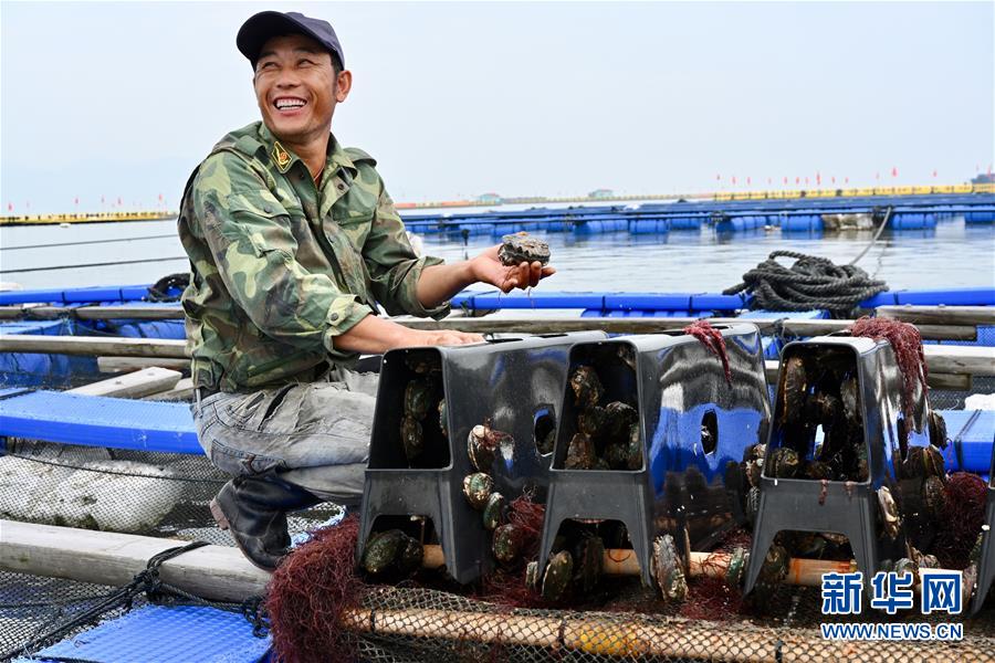6月4日,在福建省宁德市霞浦县北壁乡升级改造后的海上鲍鱼养殖区,渔民收获长势良好的鲍鱼。 新华社记者 姜克红 摄
