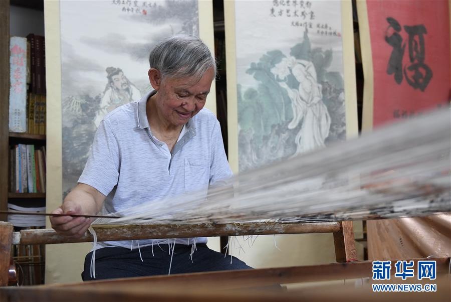 6月4日,周文虎在编织纸织画。新华社记者 林善传 摄