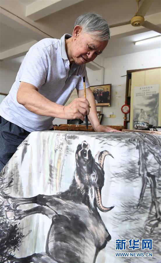 6月4日,周文虎在创作《“牛”转乾坤》纸织画的绘画部分。新华社记者 林善传 摄