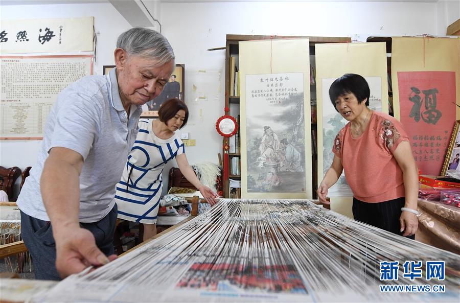 6月4日,周文虎(左一)在教女工编织纸织画。新华社记者 林善传 摄