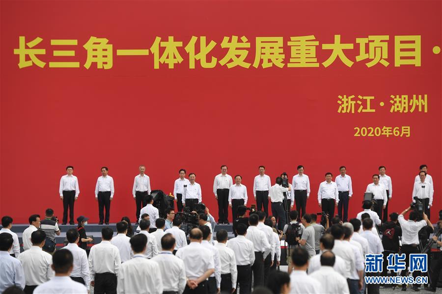 6月5日在浙江湖州拍摄的沪苏湖铁路开工仪式现场。 当日,长三角一体化发展重大项目沪苏湖铁路开工仪式在浙江湖州举行。同时,在上海、江苏同步举行沪苏湖铁路上海段、江苏段建设动员会,在安徽同步举行扬马城际铁路马鞍山枢纽工程开工仪式。 据了解,沪苏湖铁路全长约163公里,设计时速350公里,将串联起上海、江苏、浙江三地,并在湖州与商合杭铁路衔接,连通安徽,成为长三角互联互通的智能大动脉。 新华社记者 黄宗治 摄